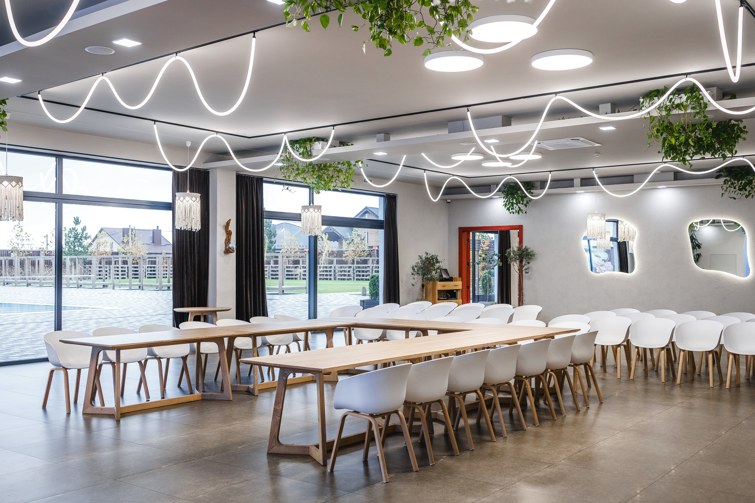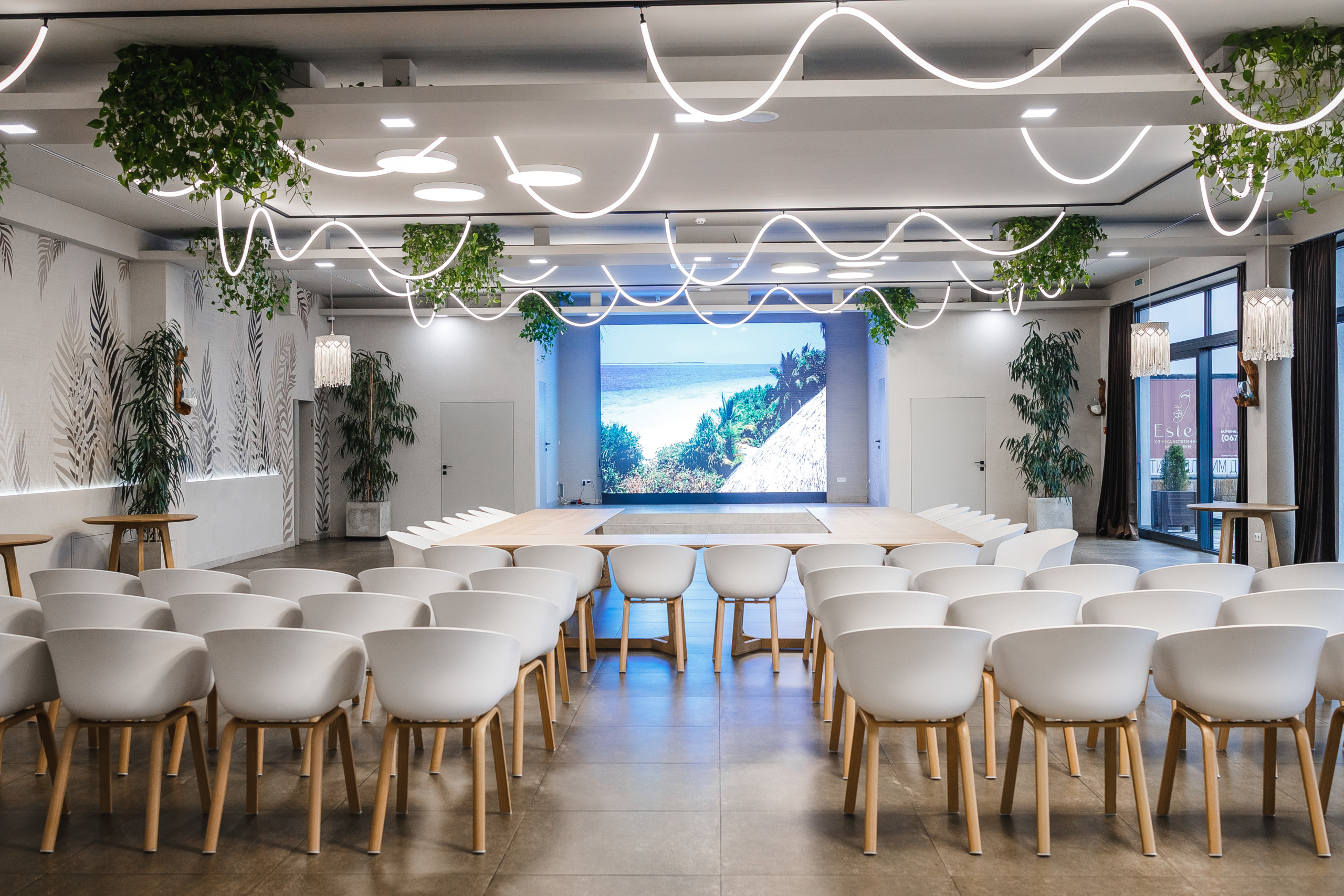 Сучасна стильна зала площею 200 м² — це ідеальний простір для проведення конференцій, ділових зустрічей, презентацій, банкетів або святкових заходів. Світле оформлення, зручне планування та професійне технічне оснащення забезпечують комфорт для кожного учасника події.