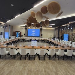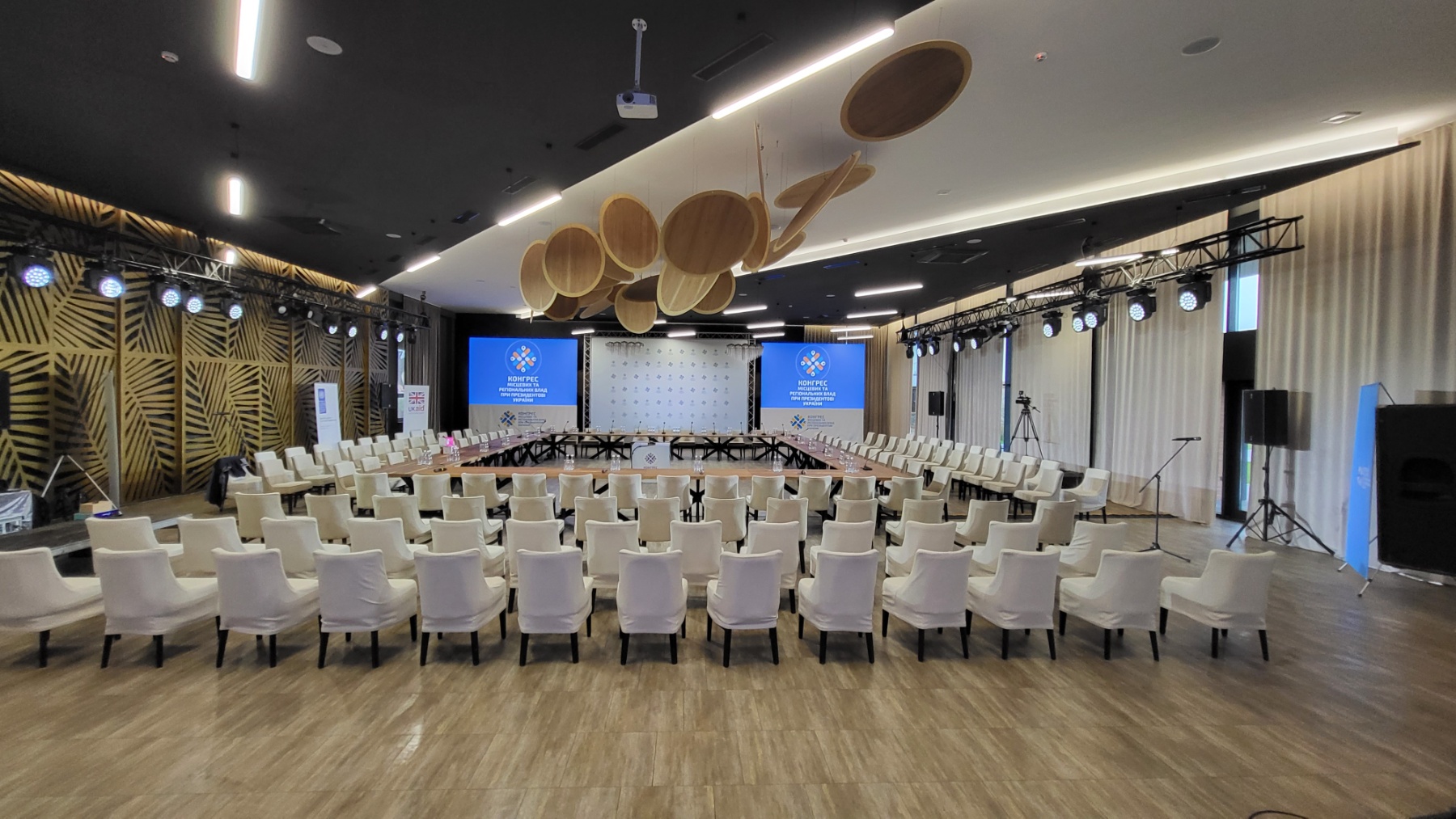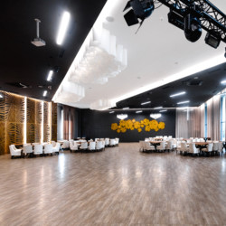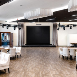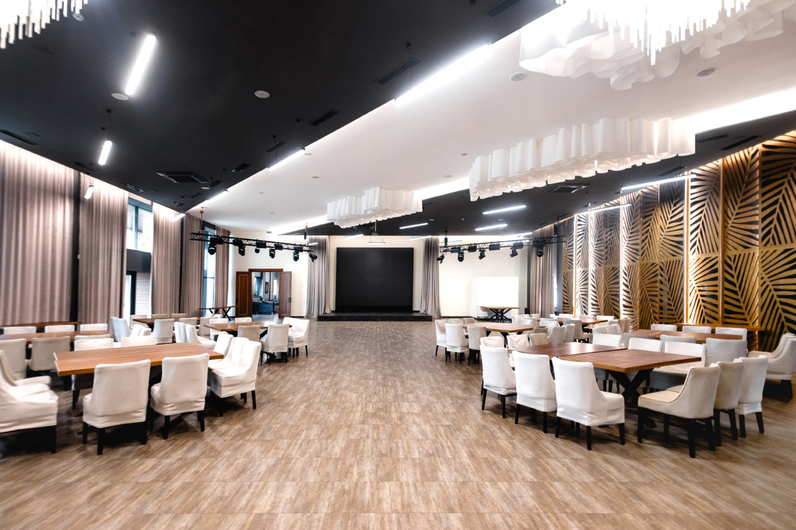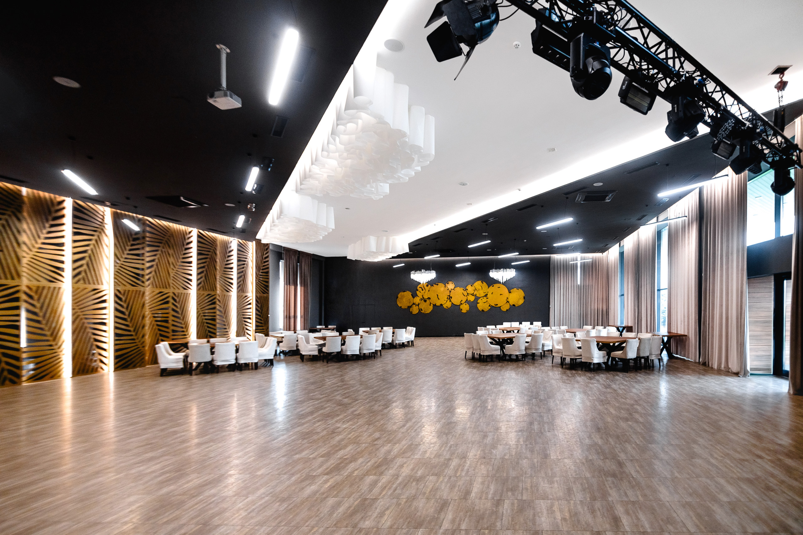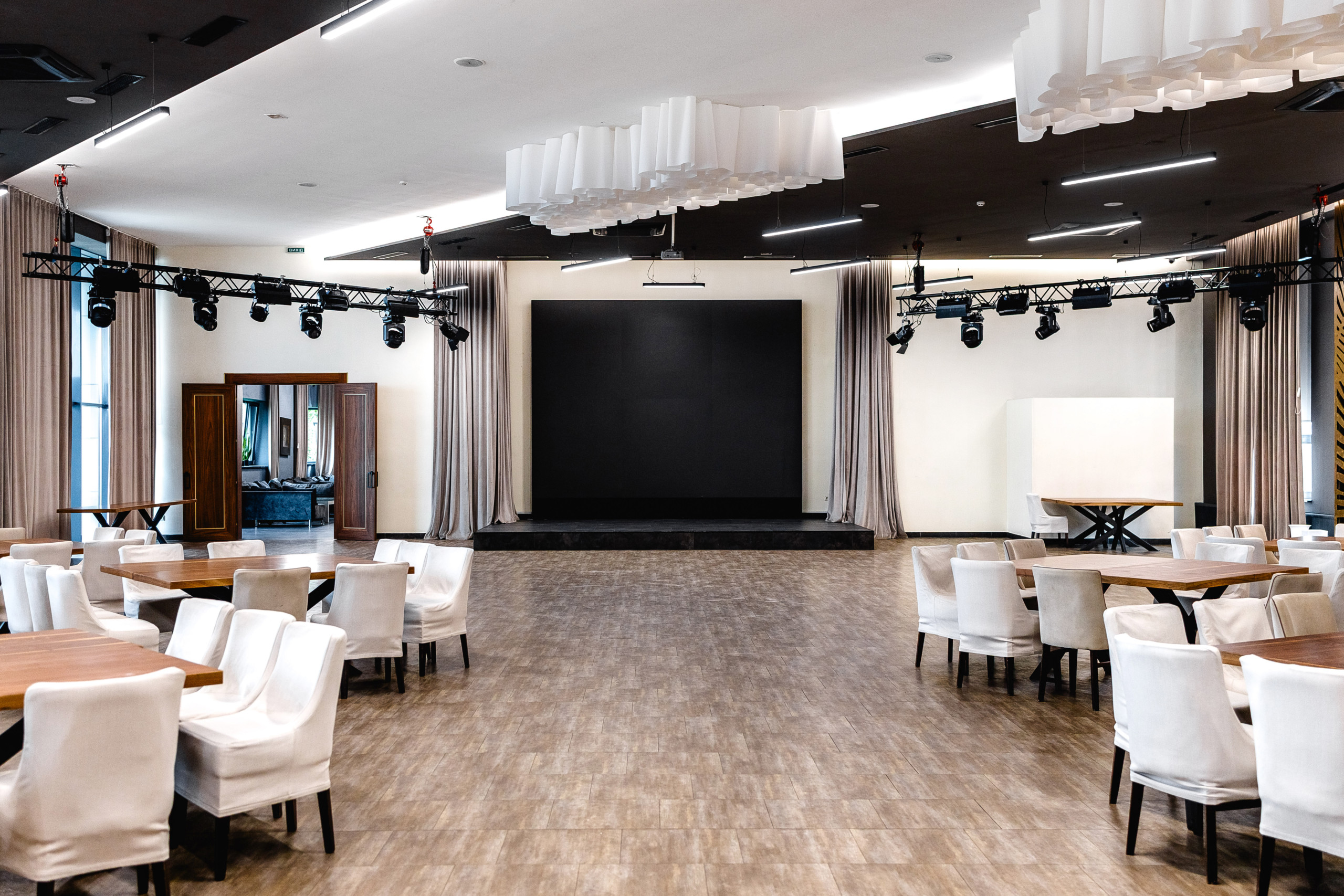 Елегантна зала площею 410 м², виконана у стильному темному дизайні, створює вишукану атмосферу для проведення великих конференцій, презентацій, банкетів, весіль або масштабних корпоративних подій. Простір оснащено всім необхідним для комфортного проведення заходів будь-якого формату — від офіційних подій до розважальних вечорів.