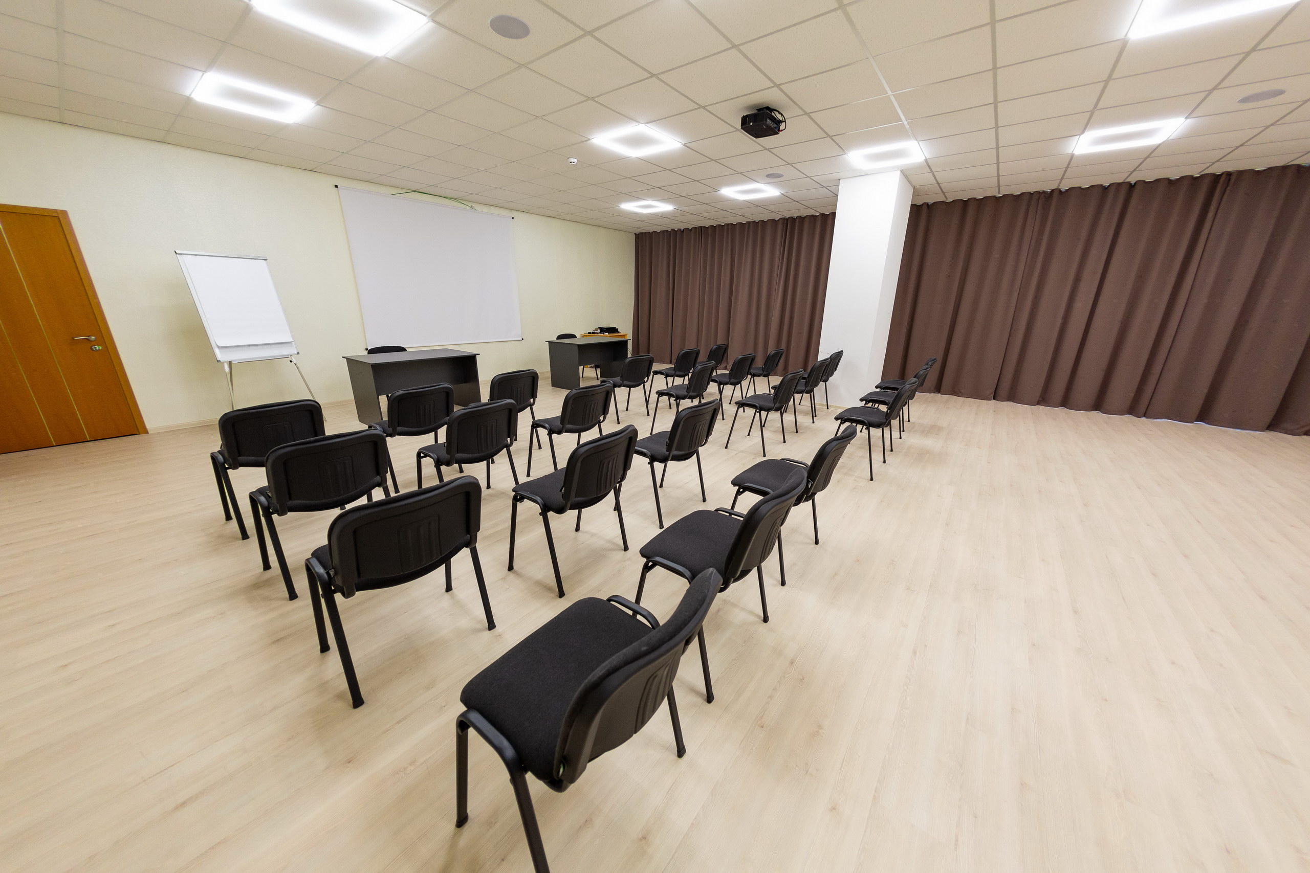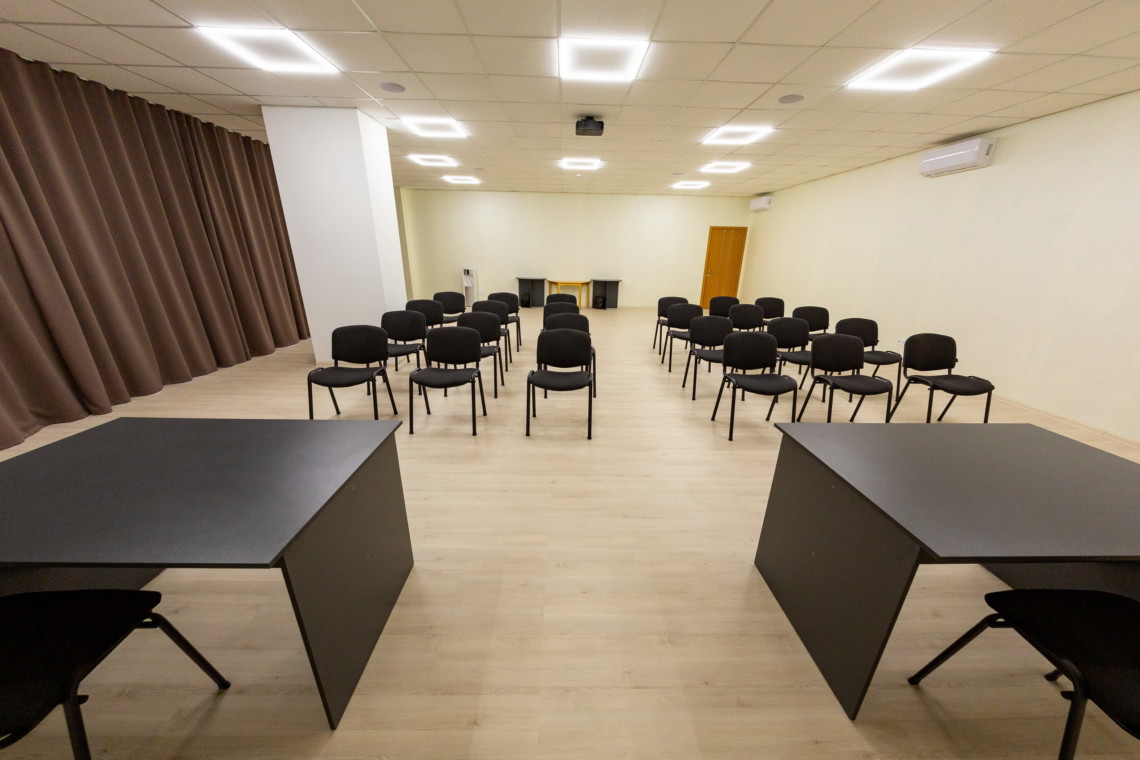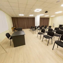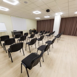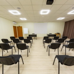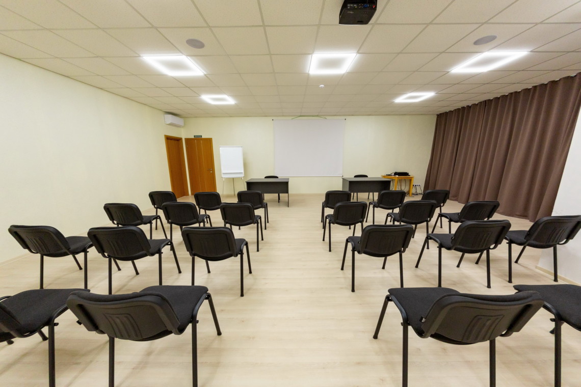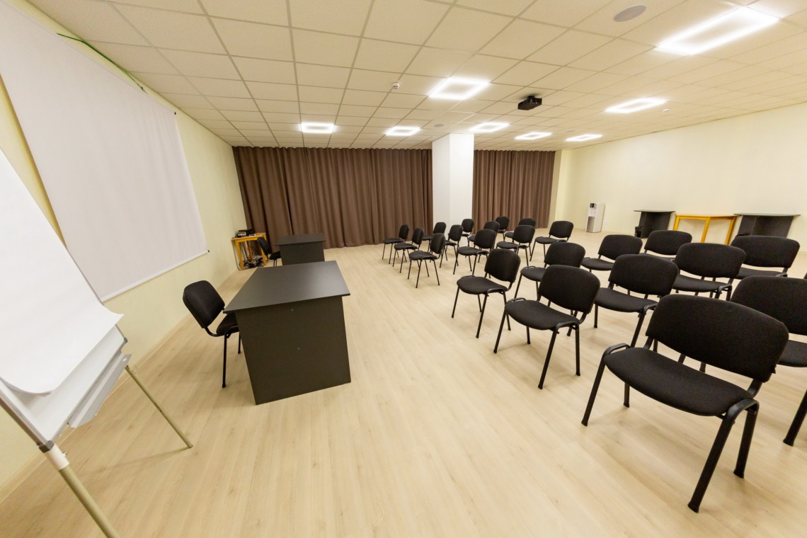 Оснащення: проектор, екран, фліпчарт, Wi-Fi, презентер (указка-клікер), звукова система, сучасні офісні меблі, система клімат-контролю.