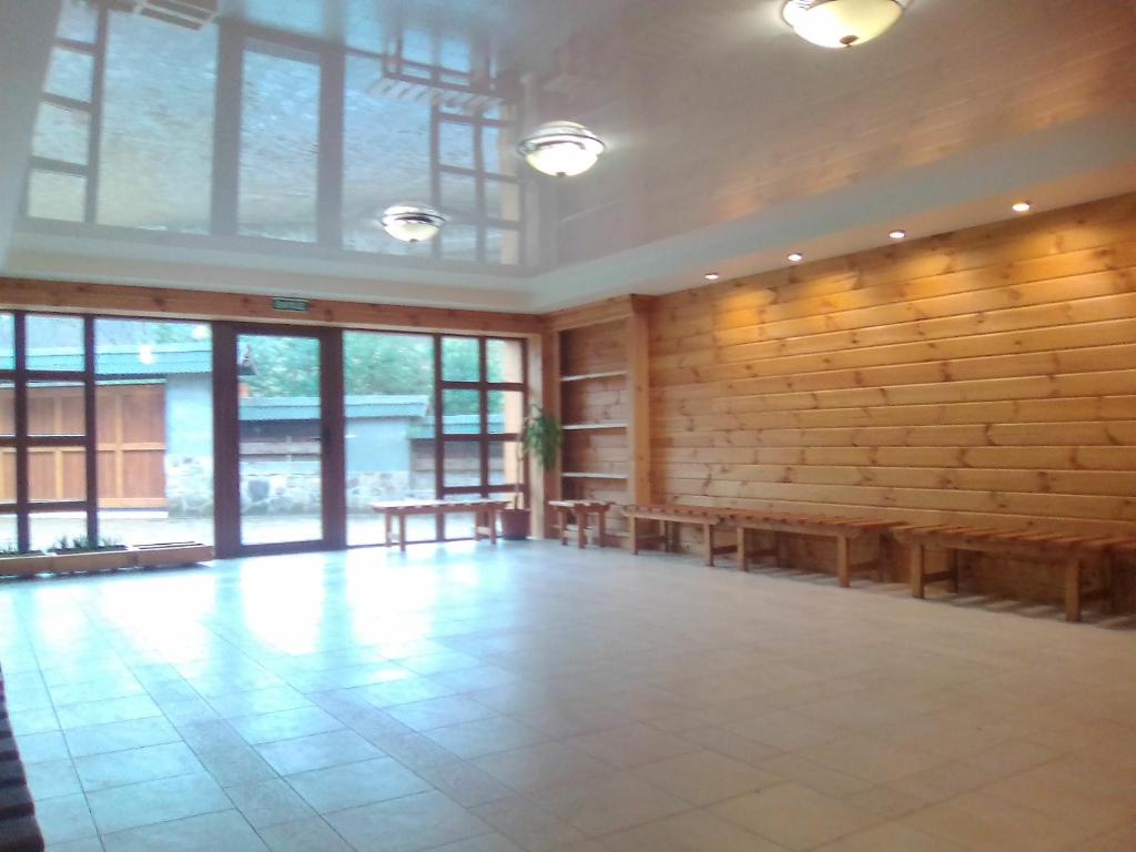 (Конференц-зал розташований на першому поверсі, має два окремі входи та прямий вихід на територію з мальовничими краєвидами.)