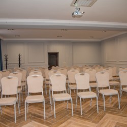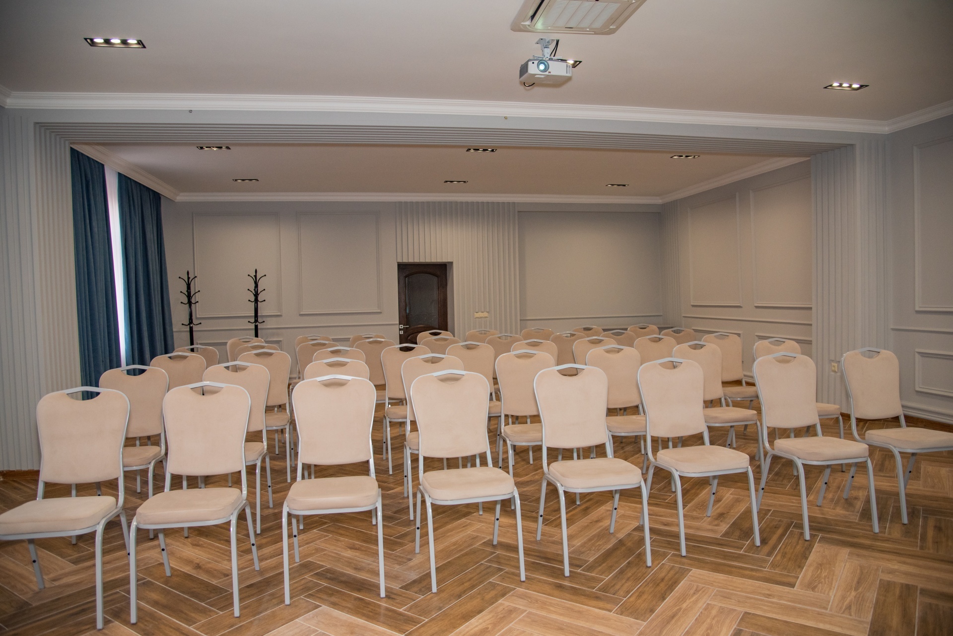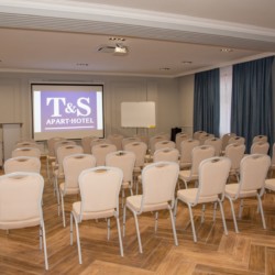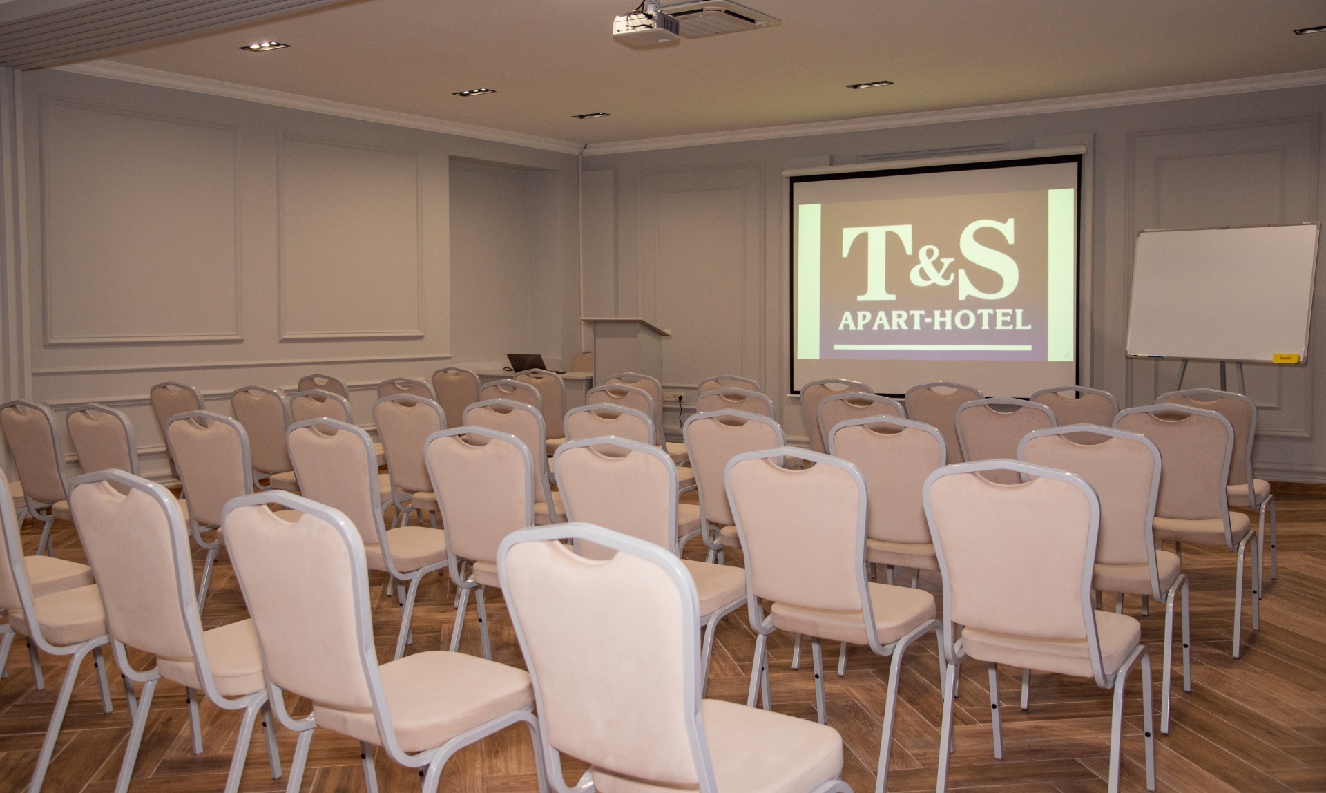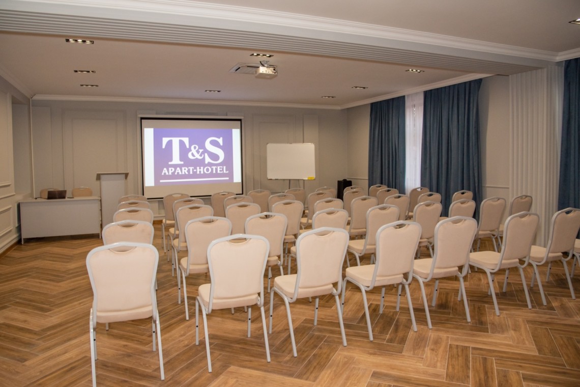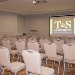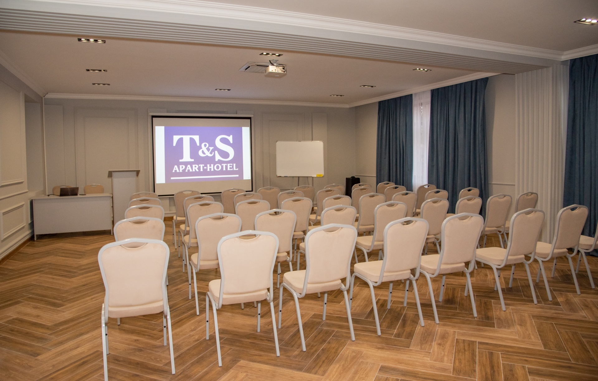 Конференц-зал в Апарт-готелі “T&S” – це просторий зал з гарним акустичним та високотехнологічним обладнанням, який може комфортно розміститися до 70 осіб. Зал надає окремий вхід для учасників заходу, місце для кавових перерв. Система якості забезпечує чистий та об’ємний звук. Проектор має високі вогні, моторизований фокус та геометричну форму корекції спотворень. Великий екран з спеціальним покриттям гарантує яскраве та чітке зображення. Конференц-зал здається для конференцій будь-якого рівня.