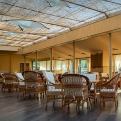 Оснащення: екран і проектор, фліпчарт з маркерами, Wi-FI, барна стійка в холі перед залом, меблі з ротанга, кондиціювання, вікна по периметру зали, штори на вікнах (зручні при використанні проектора), окремий вхід з вулиці та додатковий перехід в нижню залу, WC.